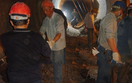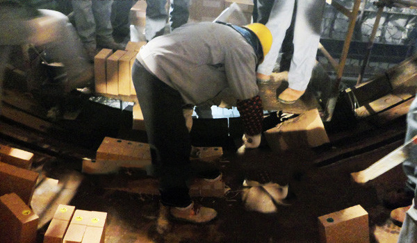 圖為工人們正在對水泥窯口安裝、并有序的進行校對砌筑。